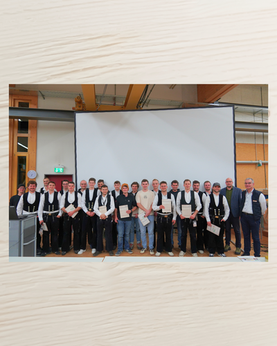 Im zweiten Teil des Abends wurden die Absolventen des Polierkurses für Studierende geehrt. Der Kurs fand im Herbst statt und baute die Kompetenzen der Teilnehmenden in den Bereichen Schiften, Treppenbau und Holzhausbau weiter aus – als wichtige Grundlage für den späteren Meisterkurs. Außerdem wurde im Rahmen des Kurses der Teil 4 der Meisterprüfung abgelegt.