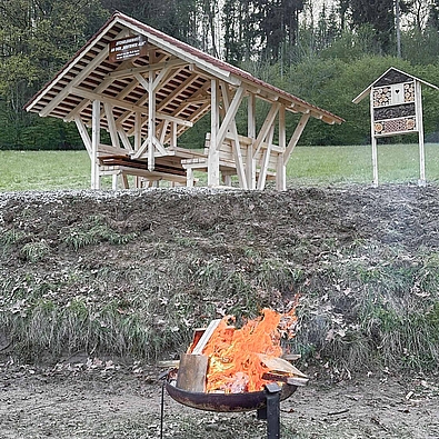 Baut eine überdachte Sitzgelegenheit für den Aussichtspunkt "Auf der Reutener Alm", Gewann Haldenäcker.