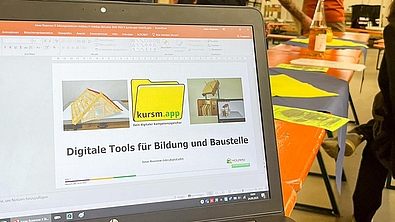 Jonas Rosenow stellte in seiner Session „Digitale Tools für Bildung und Baustelle“ vor, wie das Bildungszentrum mit seinen Auszubildenden digital in Kontakt tritt und eine Plattform bietet, auf der sich Termine, Kursinhalte und Kurszertifikate organisieren lassen. Ergänzt um die Möglichkeit, auch eigene Inhalte in der Onlineplattform kursm.app einzustellen.