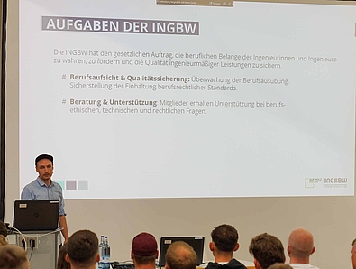Bereits ab 17:30 Uhr trafen die Gäste im Restaurantbereich zu einem ersten „Come Together“ ein. Pünktlich um 18:00 Uhr startete das offizielle Programm mit einem informativen Vortrag von Jonathan Schweizer (Ingenieurkammer BW), der über den Fachlisteneintrag bei der Ingenieurkammer Baden-Württemberg sowie die Eintragung als Entwurfsverfasser referierte.
