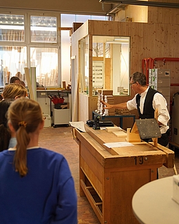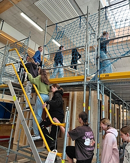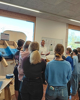 Begleitet wurde die Gruppe von einem Team aus Ausbildung und Wohnen: Eine Auszubildende gab Einblicke in den Alltag zwischen Werkstatt, Baustelle und Berufsschule, ein erfahrener Ausbilder unterstützte bei Technik, Material und Arbeitsschutz. Neben dem Werkstück ging es auch um Perspektiven: Welche Wege führen in die Ausbildung? Welche Spezialisierungen gibt es? Und welche Rolle spielt Holz als Baustoff im Kontext von Ressourcenschonung und Klimaschutz?