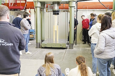 Nach dem Wechsel ins Baustofflabor der Hochschule Biberach werden die Druckversuche an der 3000 KN Druckprüfmaschine getestet und bis zum Bruch belastet.