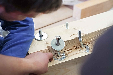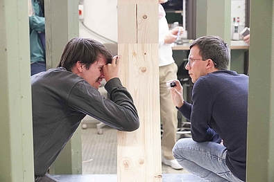 Die Studierenden erstellen hierbei zusammen mit den angehenden Polieren Knotenpunkte und Holzverbindungen aus dem Ingenieurholzbau mit verschiedenen mechanischen Verbindungen wie Stabdübeln, Dübel besonderer Bauart, Vollgewindeschrauben, verschiedenen Nägeln und Kombinationen.