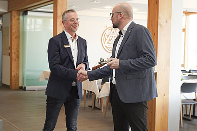 Herr Ackermann und Herr Stephan erhielten als zimmerertypisches Symbol und des „Anpackens“ einen außergewöhnlich schönen Zimmermanns-Hammer!