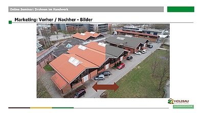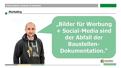 Um die Möglichkeiten des Einsatzes von Drohnen abzurunden, brachte Pauline Richter, verantwortlich im Bildungszentrum Holzbau für Marketing und Öffentlichkeitsarbeit, ihre Sichtweise ins Thema: Wie können die tollen Werte eines Unternehmens nach außen getragen werden? Welche rechtlichen Aspekte sind bei Foto- und Filmaufnahmen zu beachten? Welche Wirkung haben Bilder auf mögliche Kunden und Mitarbeiter?