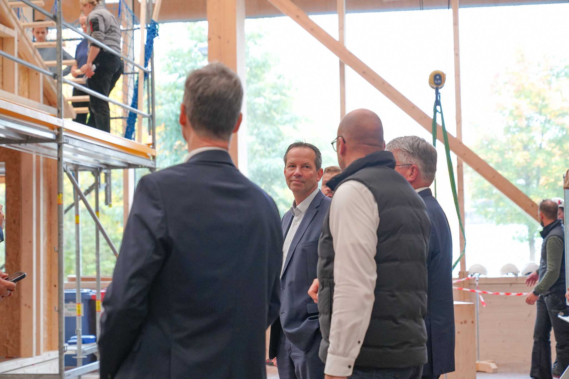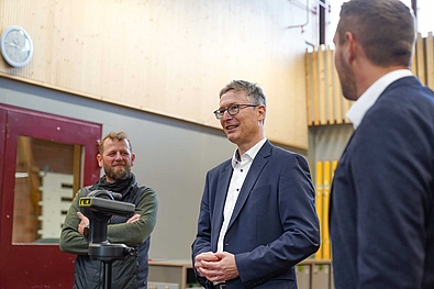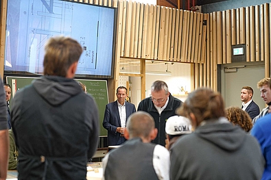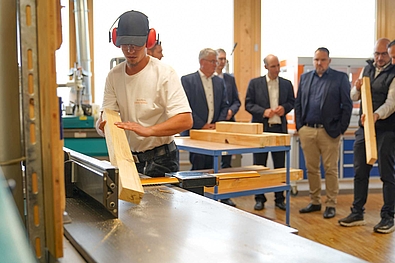 Nach einem kurzen Empfang führten unser Leiter Markus Weitzmann, Ausbildungsleiter Jan Ackermann und Konstantin zu Dohna, Hauptgeschäftsführer des Landesverbands Holzbau Baden-Württemberg, die Gäste durch unser Wohnheim, die Ausbildungswerkstätten und Seminarräume. Der Rundgang bot praxisnahe Einblicke in die moderne Ausbildung im Holzbau und machte deutlich, wie eng Theorie und Praxis in der dualen Ausbildung verzahnt sind. Ein zentrales Thema war dabei auch die ab 2026 geltende neue Ausbildungsverordnung.