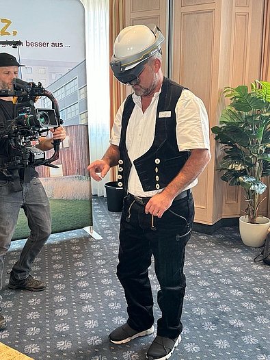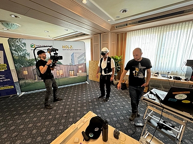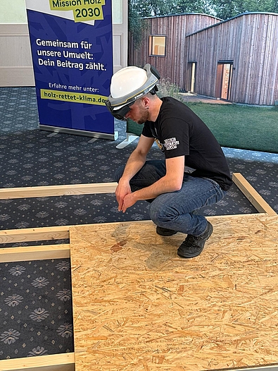 Natürlich kam der Praxisteil nicht zu kurz: So konnten sich die Teilnehmer in Immersiver Virtual Reality (also dem Eintreten in eine komplett virtuelle Umgebung) im Holzhausbau-Modell-Haus der Ausbildung umsehen oder in einer Augmented Reality Anwendung (also dem einblenden von Informationen in die reale Umgebung) Holzständer und Beplankung einer Holzständerwand auslegen.