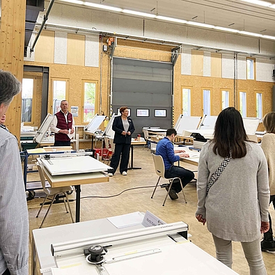 Ernst-Martin Stephan, Leiter der Fort- und Weiterbildung, erzählte die Entstehung des Zimmererausbildungszentrums und vor allem des Kompetenzzentrums Holzbau & Ausbau, welches auch gleichzeitig das Seminarhotel beherbergt.