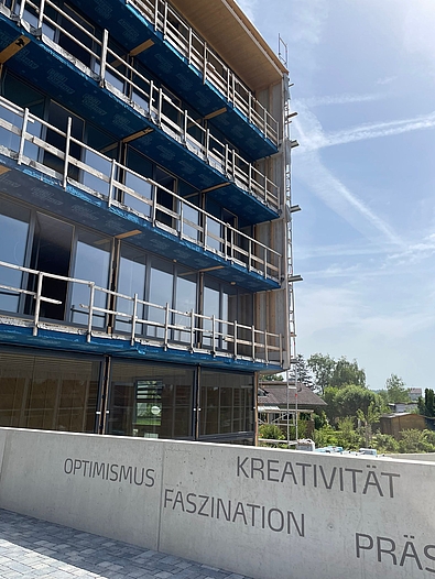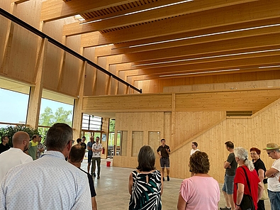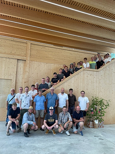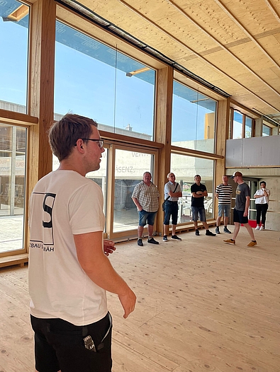 Urs Müller, Restaurator und stellvertretender Geschäftsführer, und Niklas Siewke, Baustellenleiter und Projektleiter des Neubaus, führten uns in zwei Gruppen durch die neue Produktionshalle. Diese umfasst eine Zimmerei und eine Schreinerei. Außerdem gibt es einen Komplex für Büros, Aufenthaltsbereiche sowie Azubi- bzw. Mitarbeiterwohnungen. Wir erhielten Einblick in die Produktionsprozesse, die Unternehmenswerte und neuartige Raumkonzepte.
