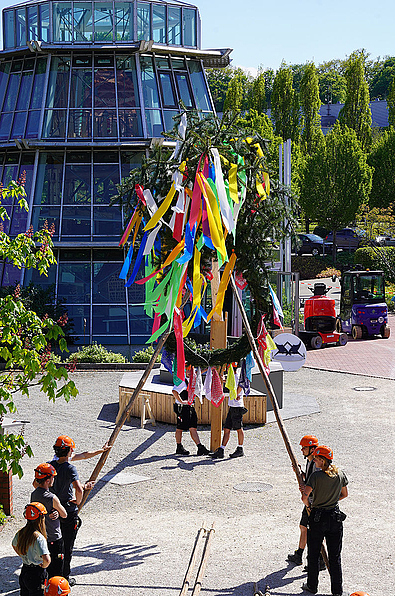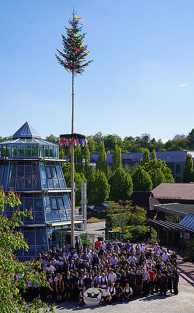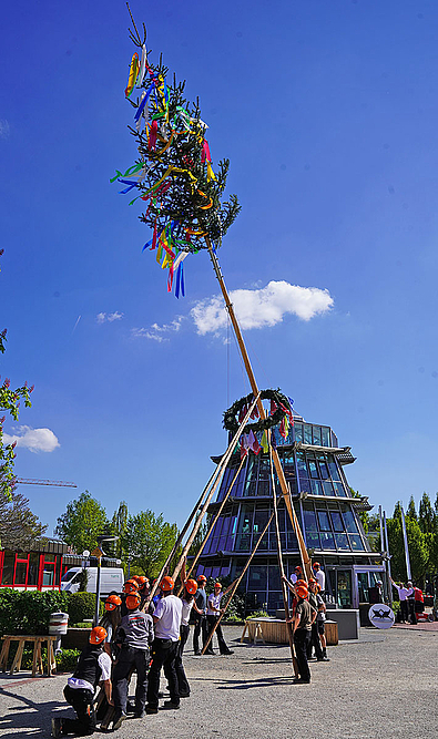 Unter Anleitung unserer Ausbildungsmeister haben unsere Auszubildenden auch dieses Jahr mit Hilfe sog. Schwalben den traditionellen Maibaum gestellt. Das Aufrichten eines Maibaums ohne Maschinen oder Geräte ist nicht einfach, da der Baum nur in sauber aufeinander abgestimmter Zusammenarbeit gefahrlos gestellt werden kann.
