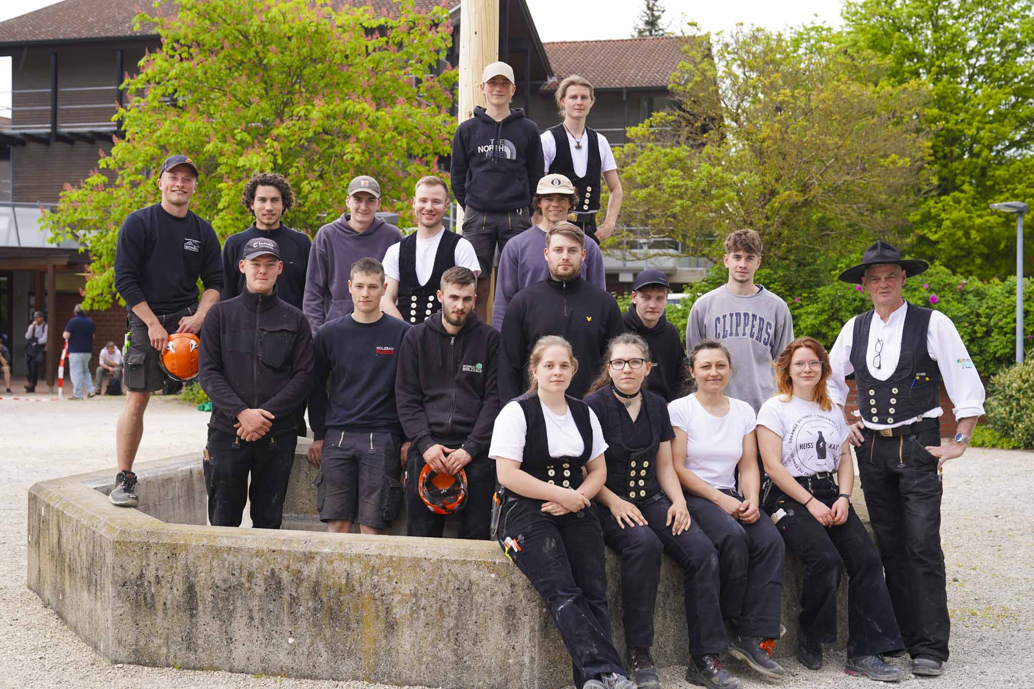 Das Aufrichten eines Maibaums ohne Maschinen oder Geräte ist nicht einfach, da der Baum nur in sauber aufeinander abgestimmter Zusammenarbeit gefahrlos gestellt werden kann.