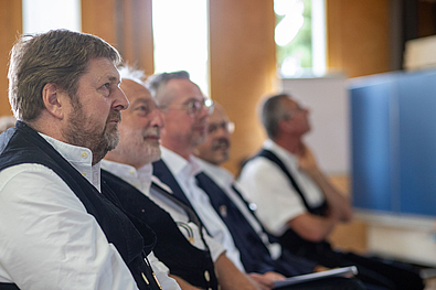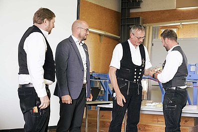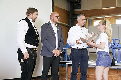 Maximilian Heise (Zimmerer für Restaurierungsarbeiten), Robin Bonath (Zimmermeister), Marvin Zapf (Geprüfter Polier im Holzbau) und Andreas Jakob (Unternehmer im Holzbau) nutzen die Gelegenheit, sich vor allen Gästen nochmals persönlich bei ihren Kursleitungen für die wertvolle Zeit zu bedanken und ihren Unterricht Revue passieren zu lassen.