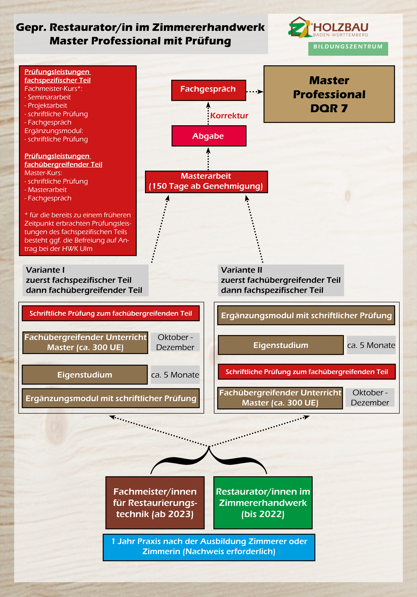 - Bestandsrestaurator/innen mit dem Titel Restaurator im Handwerk (bis 2022) und Fachmeister/innen für Restaurierungstechnik (ab 2023), die den fachspezifischen Teil als „Upgrade“ zum Mastertitel absolvieren wollen.
